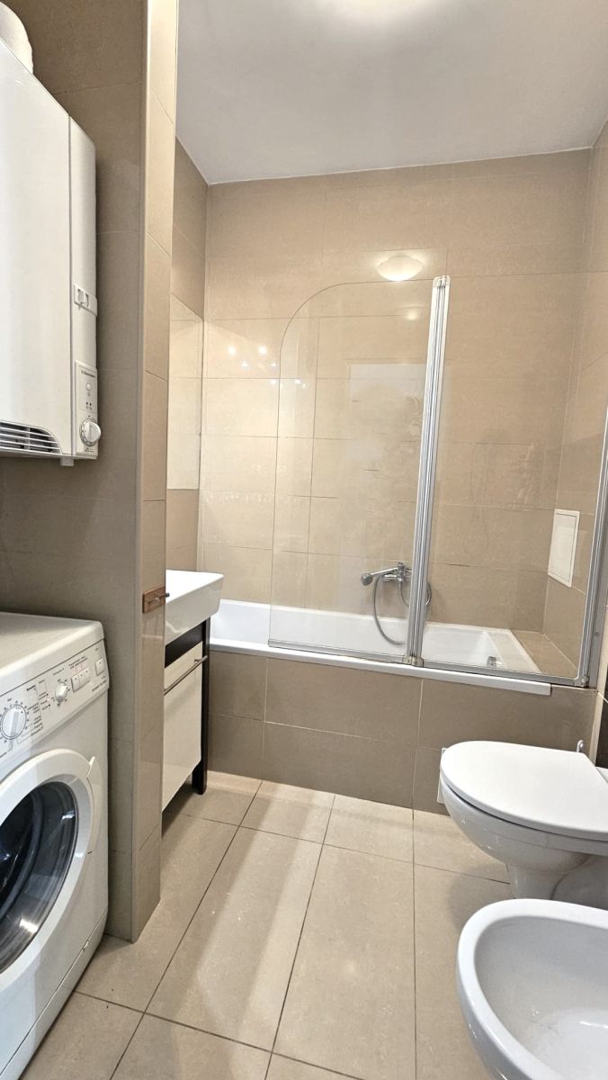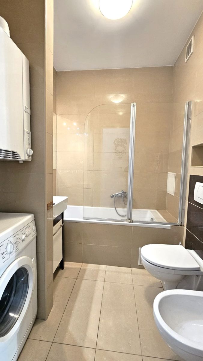 Łazienka: wanna z kabiną prysznicową, umywalka, bidet, sedes, pralka i suszarka (glazura i gładź gipsowa na ścianach, gres na podłodze)..